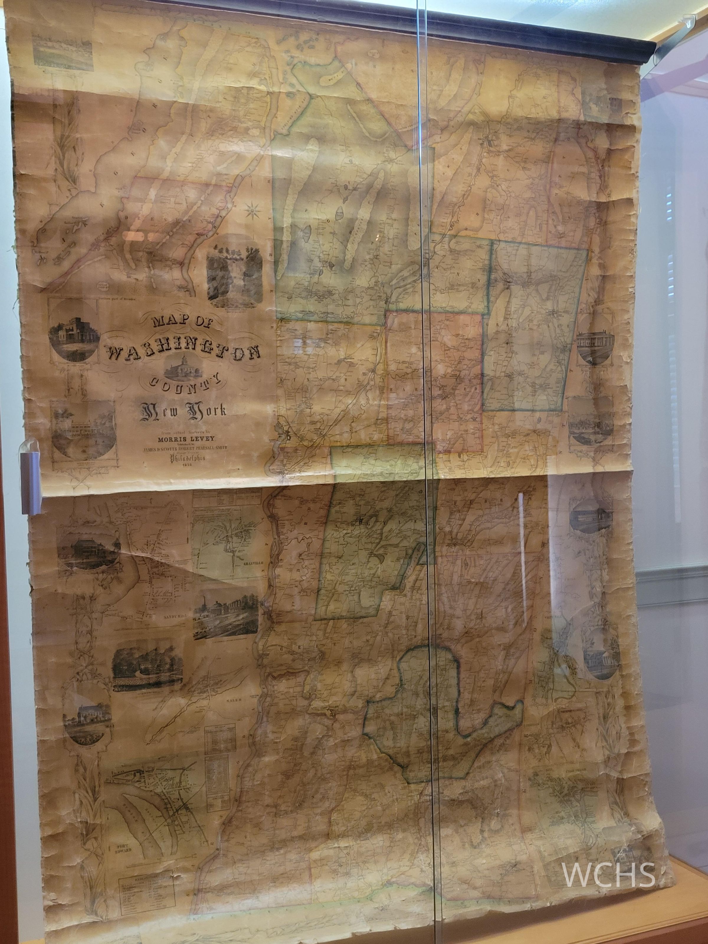 Large roll down wall map of Washington County, New York taken from the surveys of Morris Levey with property owners , church demographics, village close ups.Map Details