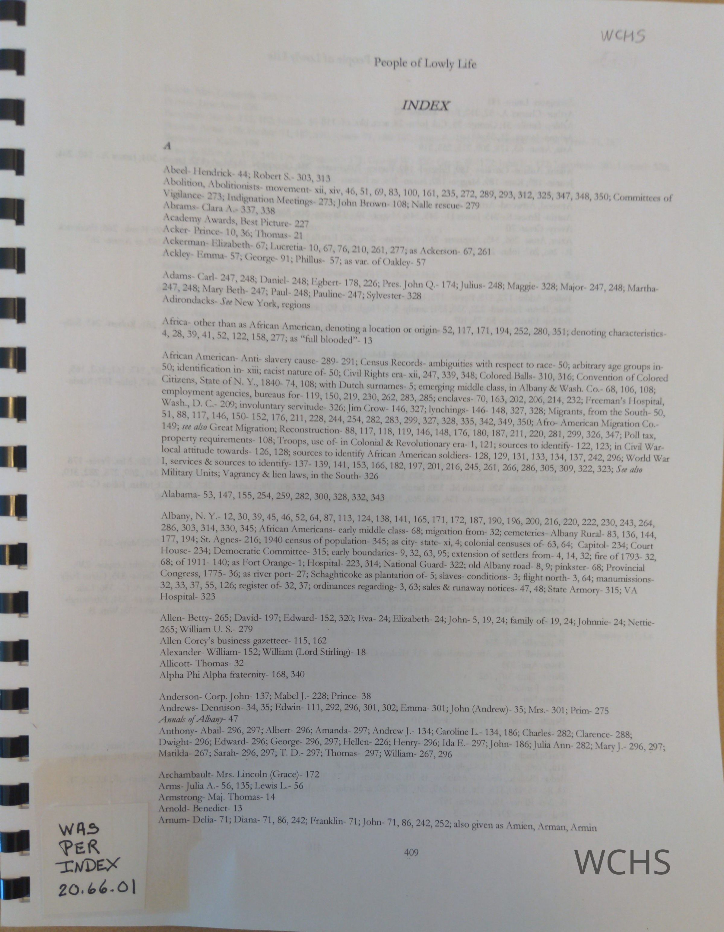 Index to People of Lowly Life, 20.45.01. Pages 409-441 Comb binding; 81/2" X 11"