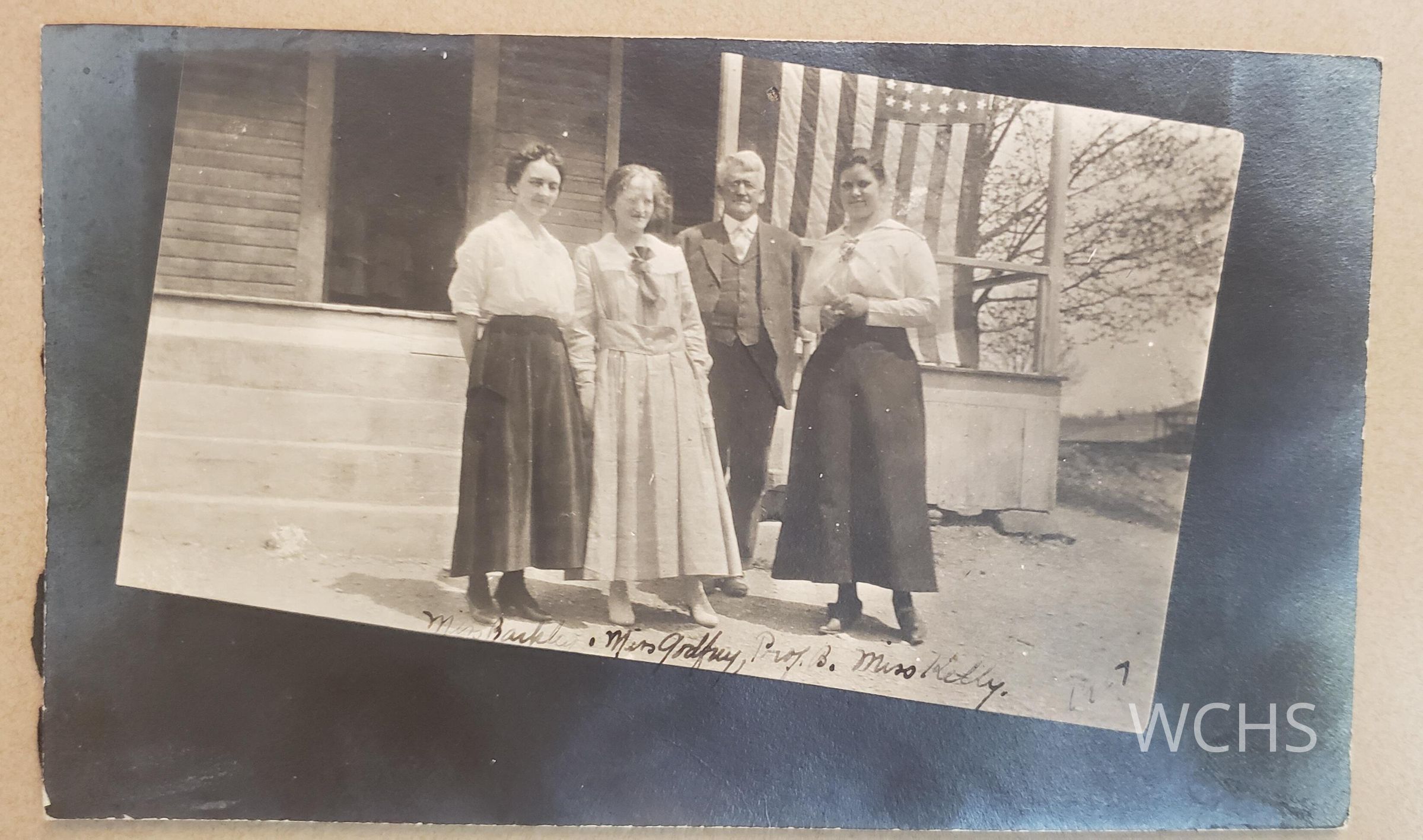 Photo postcard From left to right: Leona Barkley, Bertha Godfrey, Principal George E. Baldwin, and Abbie Kelly from the West Hebron Union School, 1917