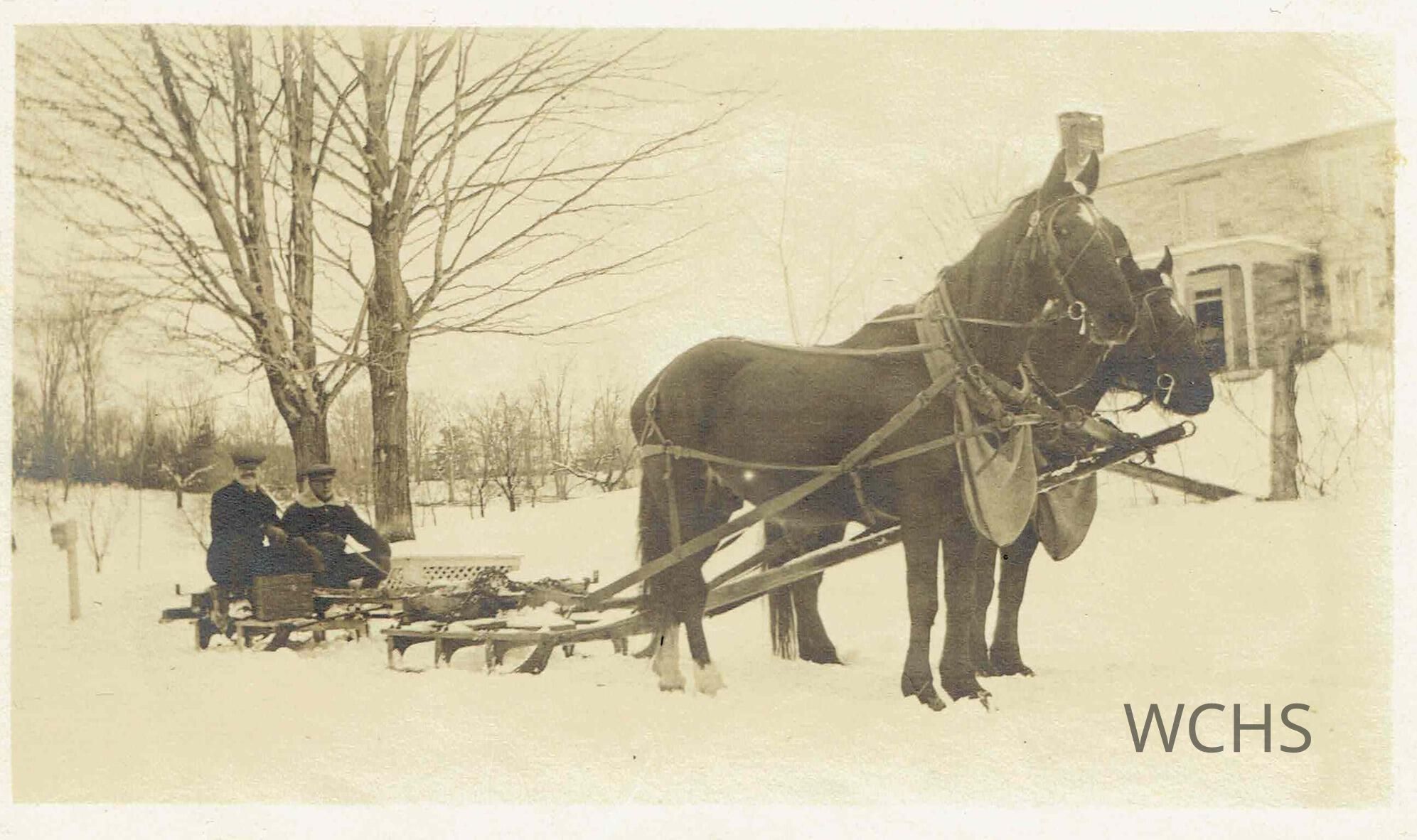 Photograph of two unidentified men sitting on a bob ( sled) being drawn by two horses behind the the stone house of Jennie Paterson McLoughlin and Charles McLoughlin in Putnam, NY.
