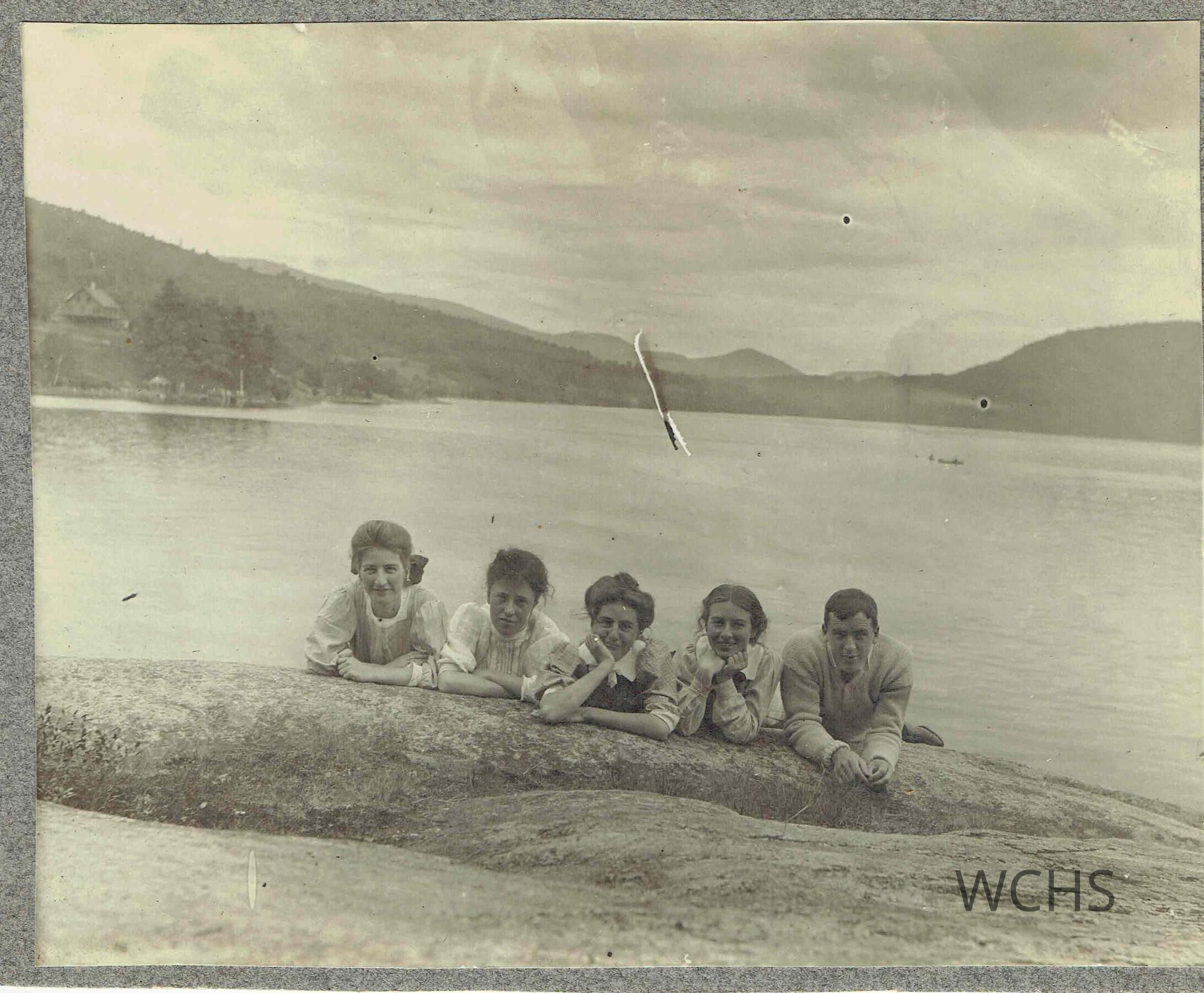Circa 1903 photograph of 5 young adults posing for the camera at the lake. From left to right is Florence Paterson (b. 1888), Marge Meiklejohn, Lois Paterson (b. 1884 in Putnam), Bess (Elizabeth) Paterson (b. 1886), and C D Hayes.