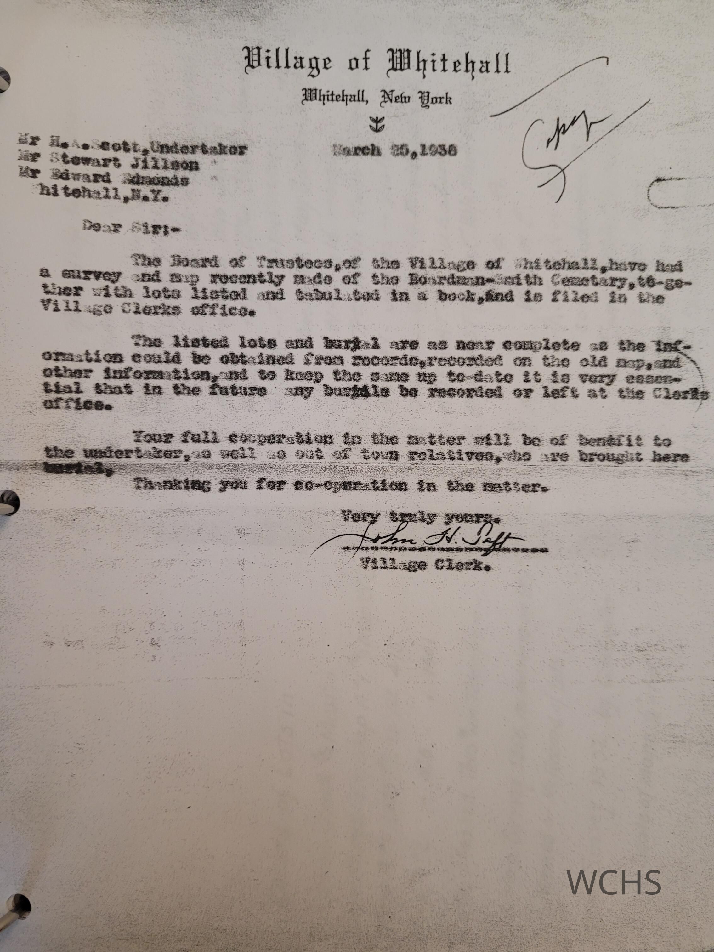 Record of Lots in Boardman, Smith and Martin Cemeteries ( Whitehall, NY) on Map A (Lots 1- 475) and Map B (Lots 476-1001). Dated 1937 by C.S. Souter. Green binder with photocopies of the original survey.