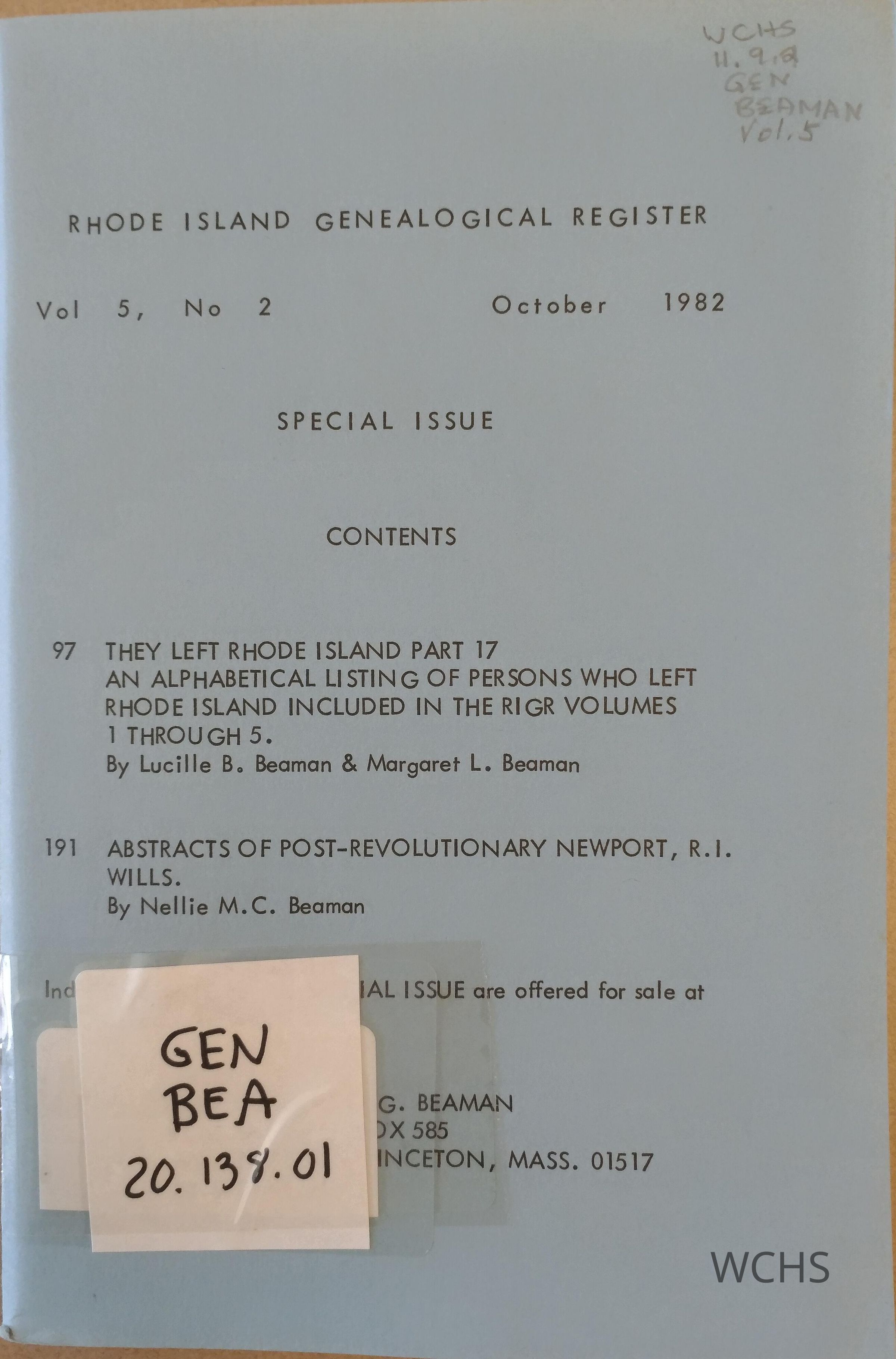 An alphabetical listing of persons who left Rhode Island included in the Volumes 1-5, this is Vol 5.Publication Details