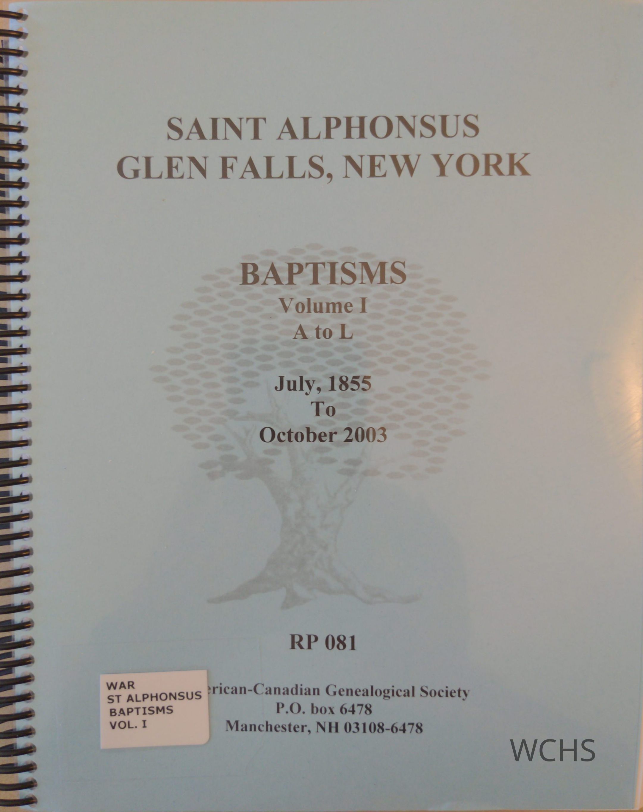 This volume (A through L) includes baptisms at Saint Alphonsus from July 1855 to October 2003.