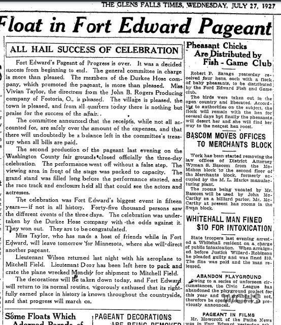This is the program for "The Pagent of Progress" a lavish show put on in Fort Edward in 1929. The show was a commemoration of the 150th Anniversary of the Massacre of Jane McCrea produced for the John R. Durkee Hose Company of Fort Edward. This unpaged, tan paperback contains many local advertisements and photographs.