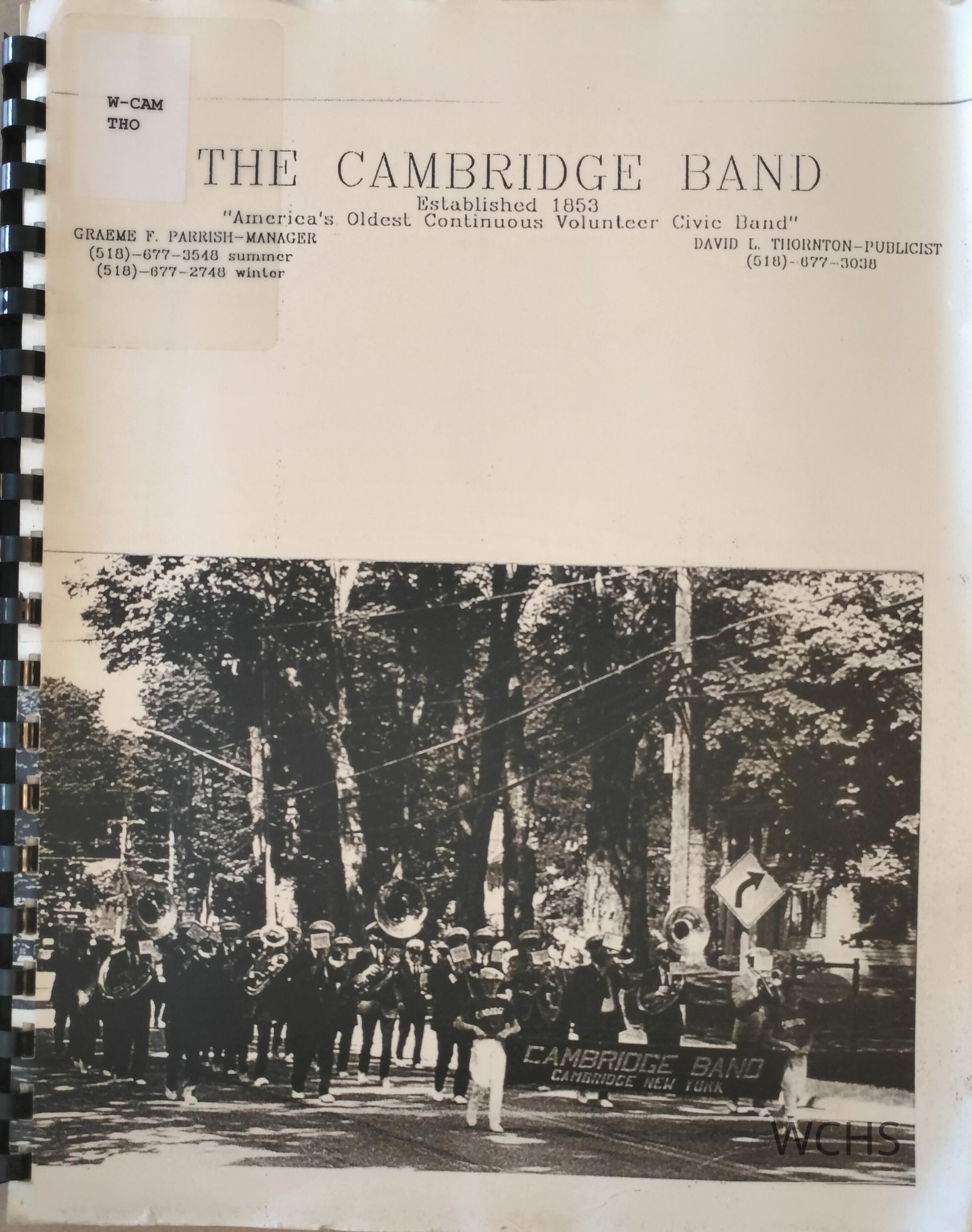 The Cambridge Band was first formed in 1853, making it one of the oldest, independent marching bands in America. Except in times of national emergency, when the band has marched away to war, The Cambridge Band has existed continuously. It is a mostly adult, male group, drawing membership from Cambridge, NY and nearby communities. Graeme "Tink" Parrish, Manager and David L. Thorton, publicist. Includes a photograph of the band and a note from Dave Thornton.