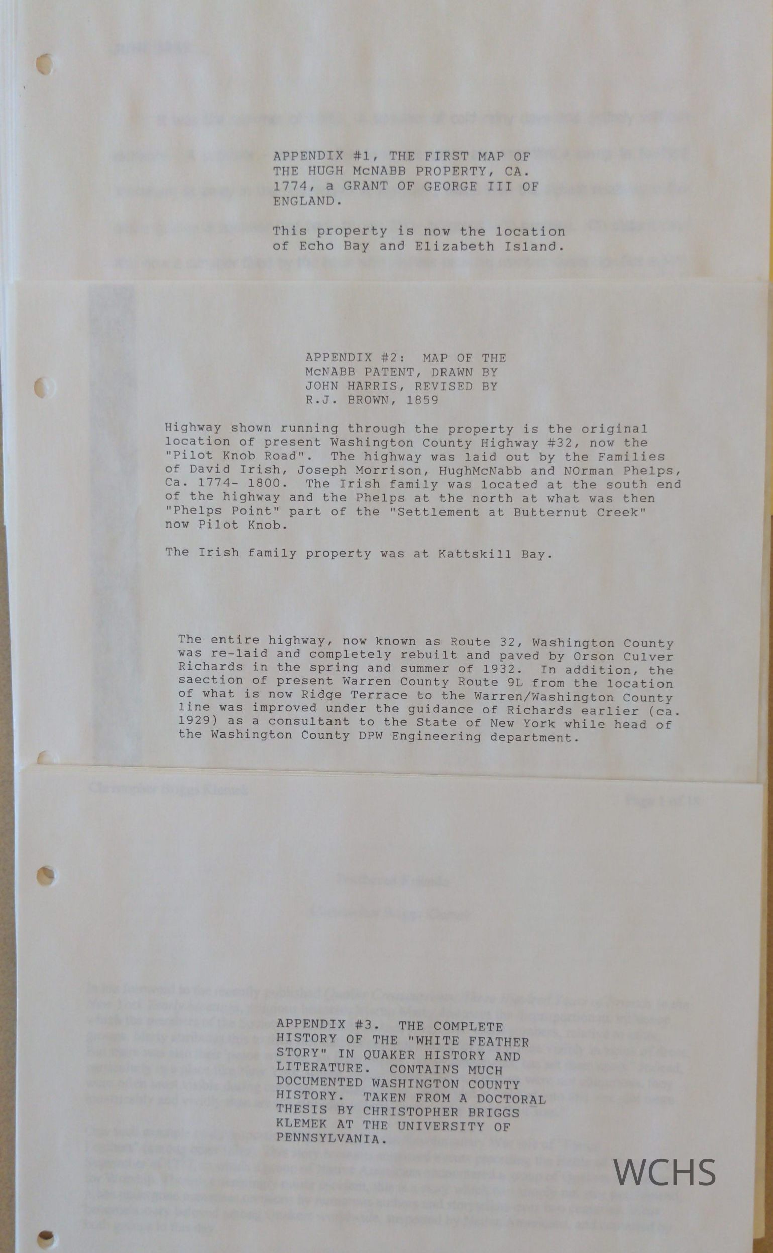 This collection includes three tales "A Brief History of Echo Bay" in the Town of Fort Ann, "A Brief History of Violet Oakley" of Philadelphia and Echo Bay, Fort Ann and "An Extended History of the 'White Feather'", a Quaker Tale in Easton. Two copies.Publication Details