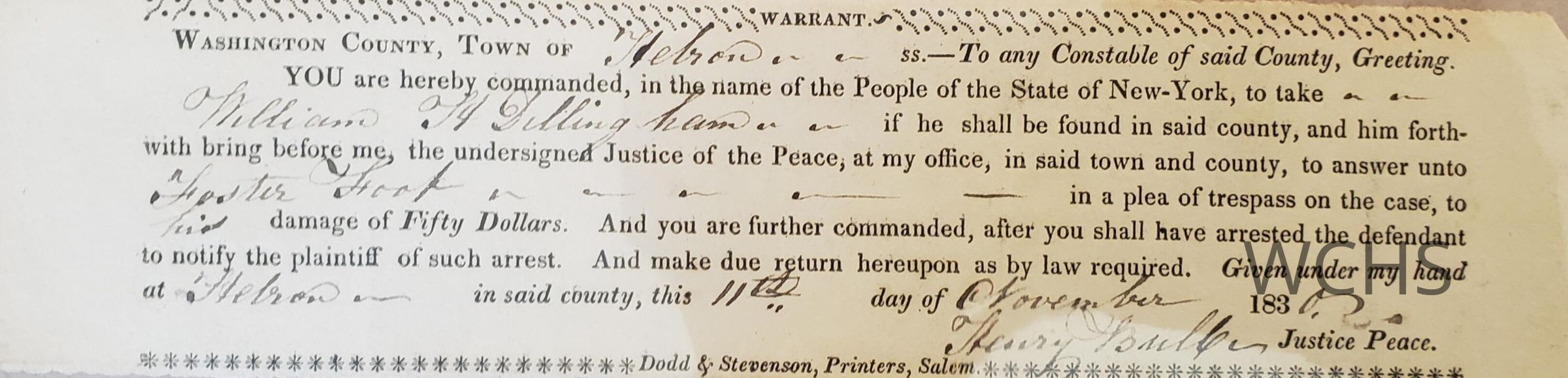 Warrent for William H Dillingham on a count of trespass against Foster Foot in 1830. Henry Bulger Justice of the Peace' Dodd&Stevenson, Printers, Salem
