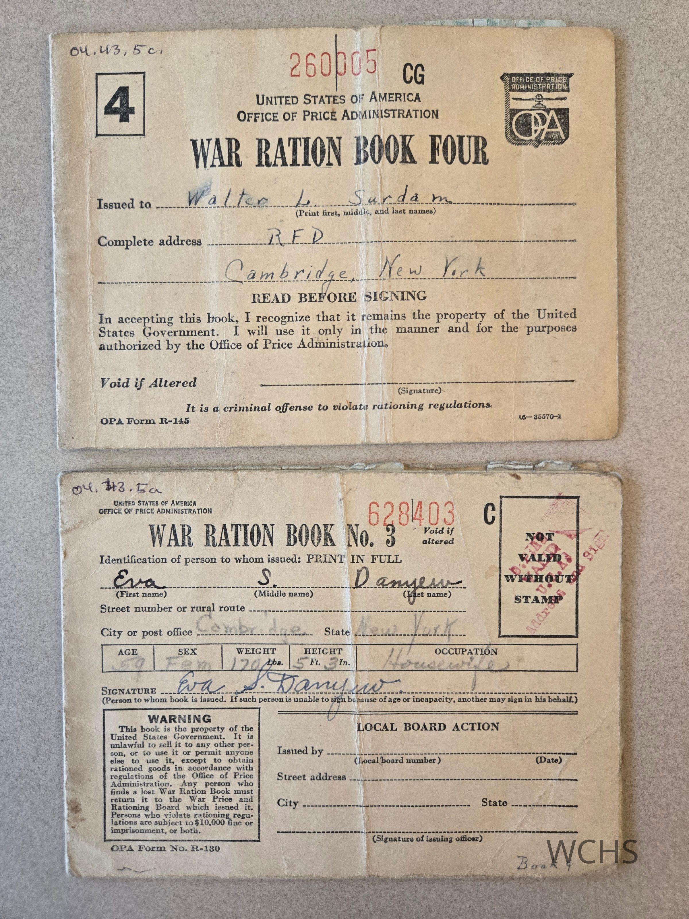 Three Ration Books from WWII includes: Eva Danyew Cambridge, NY Dorothy Danyew Albany, NY Walter L Surdan Albany, NY