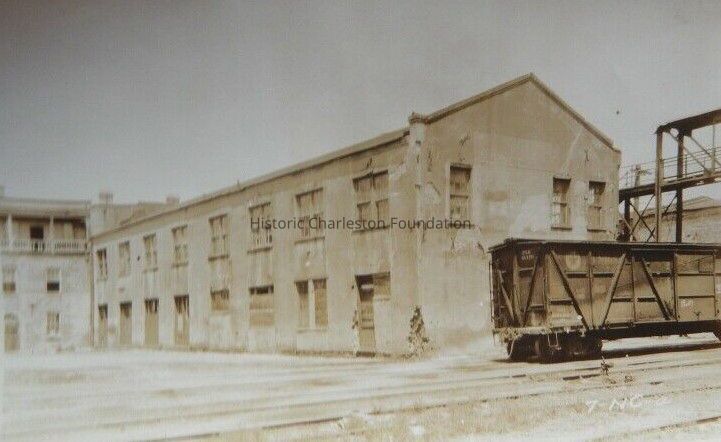a: View of the commercial buildings that had been located at 1-11 Vendue Range, southeast elevation, ca. 1924. Railroad car in foreground.