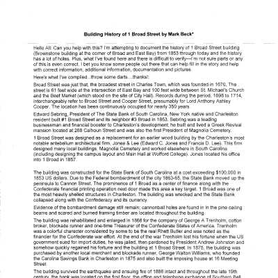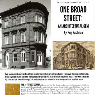 File contains articles "State Bank" (Daily Courier, 1853), "Carolina Savings Bank" (DYKYC, 1948), "Building at No. 1 Broad Street Has Served City 104 Years" (DYKYC, 1957), "Jones & Lee Designed Remarkable Buildings" (DYKYC, 1981), "Broad Embraced by Bank" (1995), "One Broad Street: An Architectural Gem (Eastman, 2016)"; building history from Information for Guides of Historic Charleston; building history by Mark Beck (building owner); brochure "One Broad Street: The Story of a Building and its Times"; copies of images from books including Antebellum Architecture & Civic Destiny, Charleston in 1883, Architects of Charleston, Charleston Illustrated, The Doors and Gates of Charleston; realtor's sales brochure (2009); plats (1852, 1866).