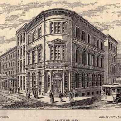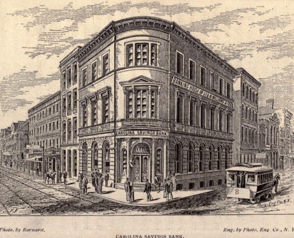 Constructed 1853; restored 1978. Edward C. Jones and Francis Lee, architects. Jones and Lee, Charleston's most notable antebellum architectural partnership, designed this 3 story brownstone building in the Renaissance Revival style. Damaged by shelling in the Civil War, it was reopened in 1868 for the company of former blockade runner and confederate treasurer, George Trenholm. The edifice was purchased in 1875 for the Carolina Savings Bank owned by George Williams, builder of the imposing house at 16 Meeting Street. Important exterior features include the curvilinear bay with entry door and engaged portico, and the dissimilar lion-headed keystones above each first floor window. The interior lobby was restored when the building returned to bank usage in 1978 and still contains its Rococo Revival style plaster cornice and frieze. (Source: The Buildings of Charleston by Jonathan Poston.)