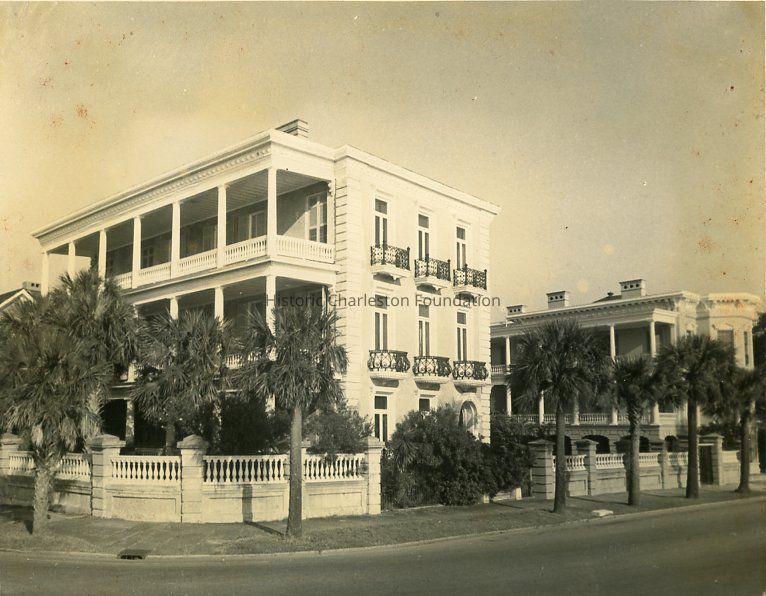 B&W photograph of 1 East Battery (Louis DeSaussure House), located at the corner of East Battery and South Battery, showing the southeast corner of the building. 5 East Battery (John Ravenel House) is also in view at the right.Photograph Details