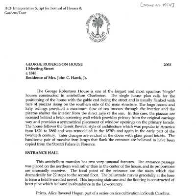 File contains FOHG house history (2003); newspaper articles (including DYKYC, and Mercury 2013) (one with illustration of original Ralph Izard house [poor quality copy]); title page of book Ross Memorial Museum compiled by Annie M. James and newspaper article (1934) about the Ross Collection; document entitled "Historic Evolution of 1 Meeting Street" showing the development of the property through maps; excerpt from book The Doors and Gates of Charleston (Thompson) showing photos of details; index to HABS photograph documentation.Collection