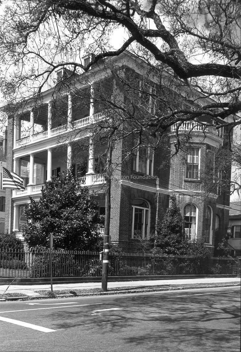 Constructed ca. 1846. George Robertson built this house on the site of Senator Ralph Izard's late-18th century town house destroyed in a fire some years earlier. Izard's mansion was designed by James Hoban, architect of the White House. Robertson's later side-hall plan house, among the largest in Charleston, included the most recent innovations. The primary entrance from Meeting Street boasts splendid double doors with glazed panels and flanking cast-iron lanterns. The piazza is masked on the east for the entire three floors. After the Civil War, the Ross family acquired the house and Miss Mary Jane Ross filled the dwelling with exotic art objects and splendid decoration in the Victorian manner. At her death in 1922, her will attempted to leave the house in trust as a museum, but the provisions were struck down by the State Supreme Court in 1944 and most of the collection sold at auction.