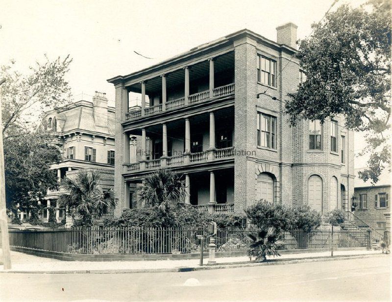 B&W photograph of the George Robertson House (Meeting Street), southeast corner, showing piazzas. 20 South Battery at right.Collection