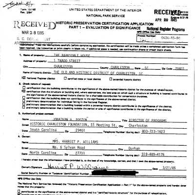 Three files contain documentation of the easement on the property including related correspondence and Confirmation of Understanding; letter regarding appraisal value; Part I certification (National Register); annual inspection reports, requests for alterations, and correspondence related to the management of the property; history of house in newspaper article (1932); Preservation Progress article (March 1963); house history from Information for Guides of Historic Charleston (1984); house history from City of Charleston Tour Guide Training Manual (2011).