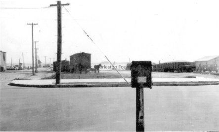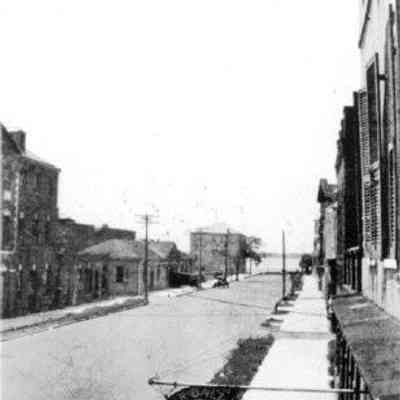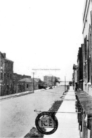 2: Looking south on East Bay Street from ca. 75 East Bay Street. Portion of Vanderhorst Row (76-80 East Bay) visible at left and Missroon House in background. Sign for "Peter Balzano [Battery Store] Ice, Drinks, Fruit, Cigars" in foreground [75 East Bay Street?].
