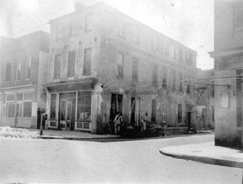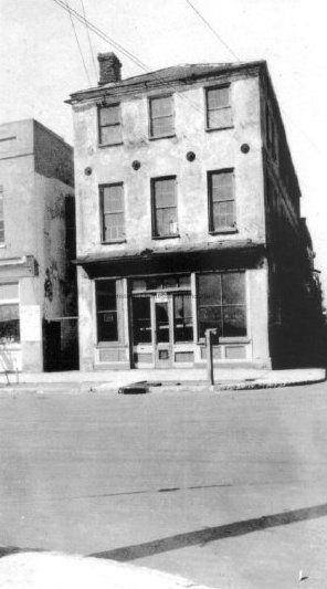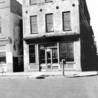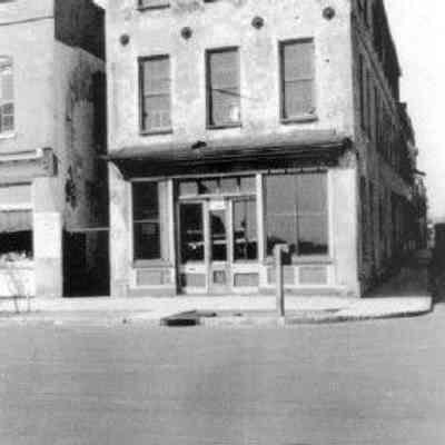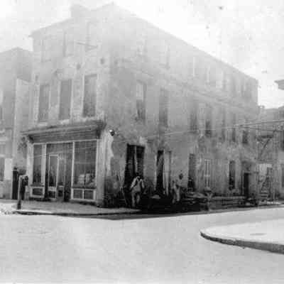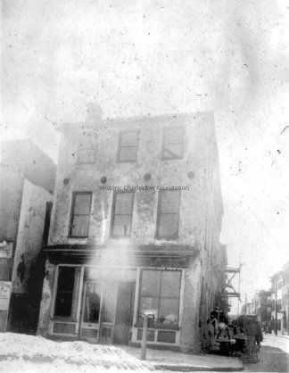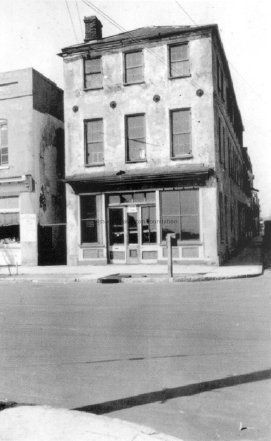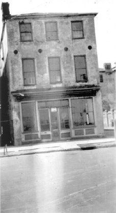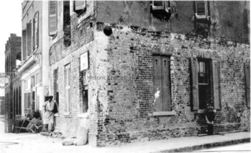 6: East Bay Street elevation of 1 Tradd Street [77 East Bay Street?] before renovation, with storefront intact. Southwest corner somewhat visible. Portion of house on north side of Tradd Street (6 Tradd?) in background (see #18).
