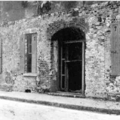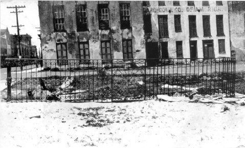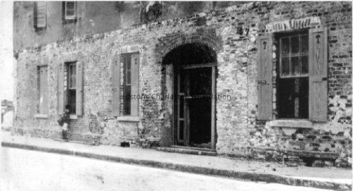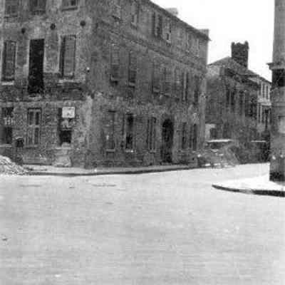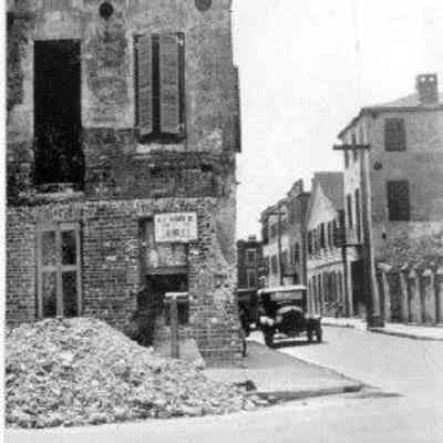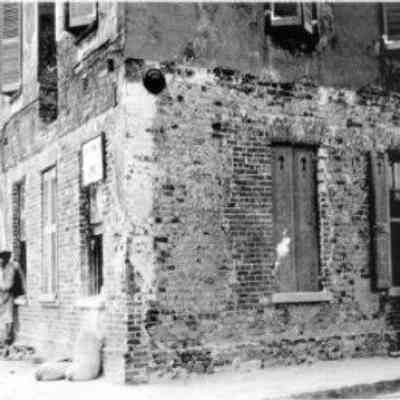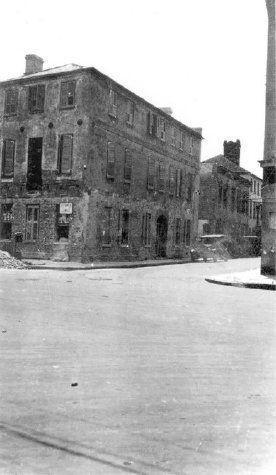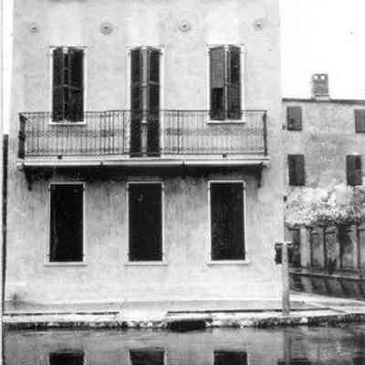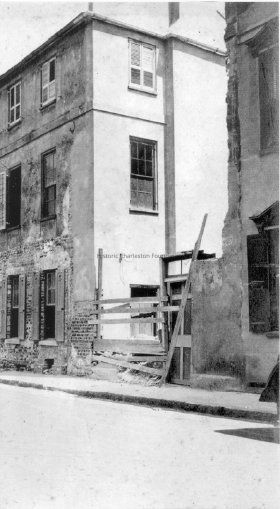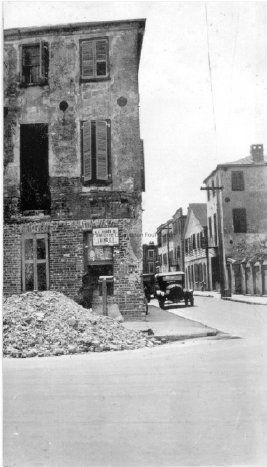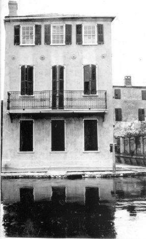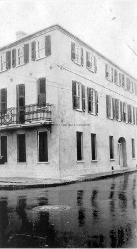 17: Northeast corner of 1 Tradd Street after renovation; balcony installed. Street appears to be flooded.