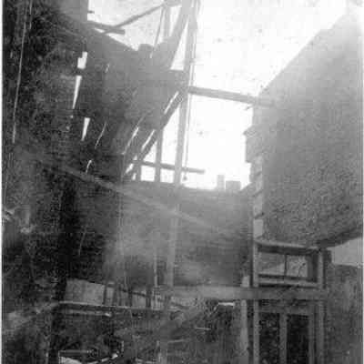 7: Northeast corner of 1 Tradd Street during renovation, and neighboring building [75 East Bay Street?] and edge of 79-81 East Bay Street. Workmen in front of Tradd Street elevation.
