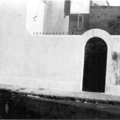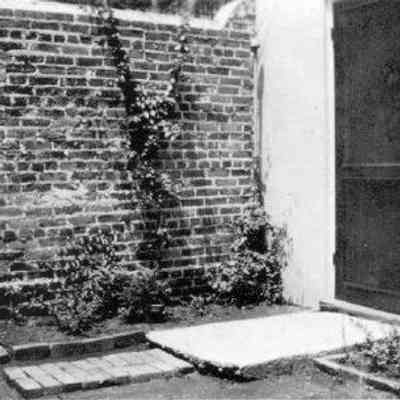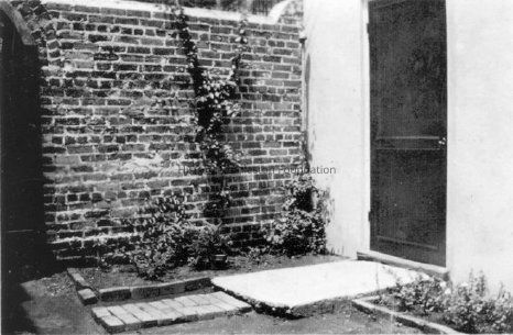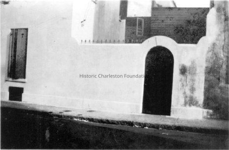 26: View of garden wall, garden entrance, from inside the garden area. Portion of building on north side of Tradd Street in background.