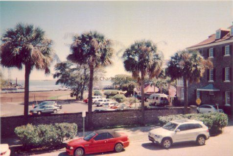 1: Looking east across East Bay Street street from 1 Tradd. Small portion of South Adger's Wharf visible at left. Mailbox in foreground. (See #28-29.)