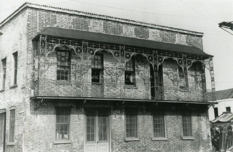 Reprint of a photograph of 10 Exchange Street showing the east elevation (Prioleau Street) with its cast-iron balcony.