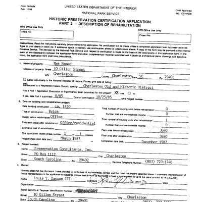 10 Gillon Street is a good example of early-19th century Charleston architecture. It was constructed ca. 1820 and the exterior has changed very little over the years. The interior was converted into office space but retains some of the original finishes. It is a 3½ story stuccoed brick structure with a pan tile roof. The second floor is dominated by a central paired French door leading to a circular wrought iron balcony. (Source: Historic Preservation Certification Application, Part 1, Laurens Collection.)