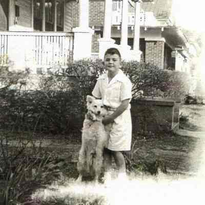 Photo 2: View of 10 Sutherland Avenue (left) and 8 Sutherland Avenue (partially visible at right), front elevation, corner view. Boy stands with dog on lawn. Dated 1950.