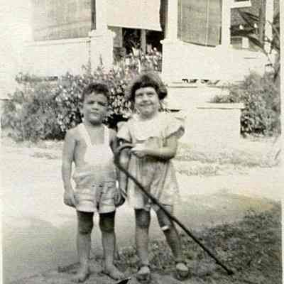 Photo 7: View of 12 Sutherland Avenue (left) and 10 Sutherland Avenue (right). Girl and boy stand in the foreground. Ca. 1950s.