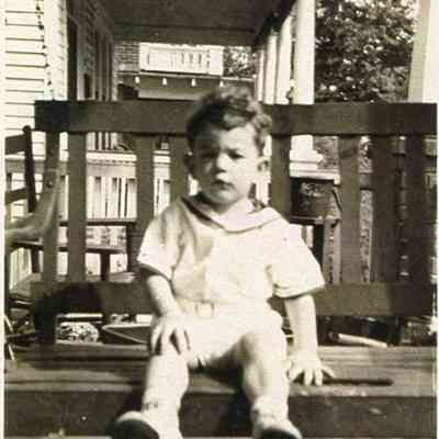 Photo 4: Side view of the porch of 10 Sutherland Avenue, side view of porch. Boy on porch swing in the foreground. Dated ca. 1950s.