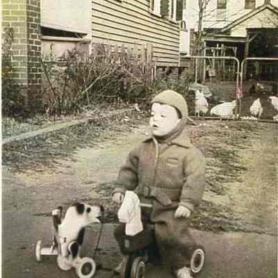 Photo 9: View of a boy on a tricycle in the driveway of 12 Sutherland Avenue. Chickens behind fence in background. Ca. 1950s.