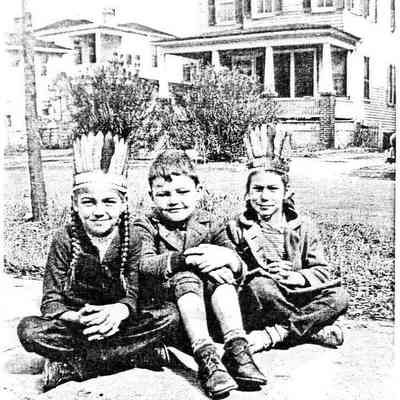 Photo 10: View of 12 Sutherland Avenue. Three children dressed as Indians in foreground; identified as "Barbara, Wes, and Cleary Bennett. Leitch house in background." Ca. 1950s.