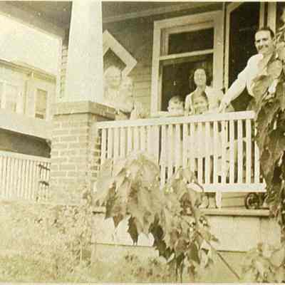 Photo 11: View of 12 Sutherland Avenue. Partial view of 14 Sutherland Avenue in background. Family stands on front porch. Ca. 1950s.