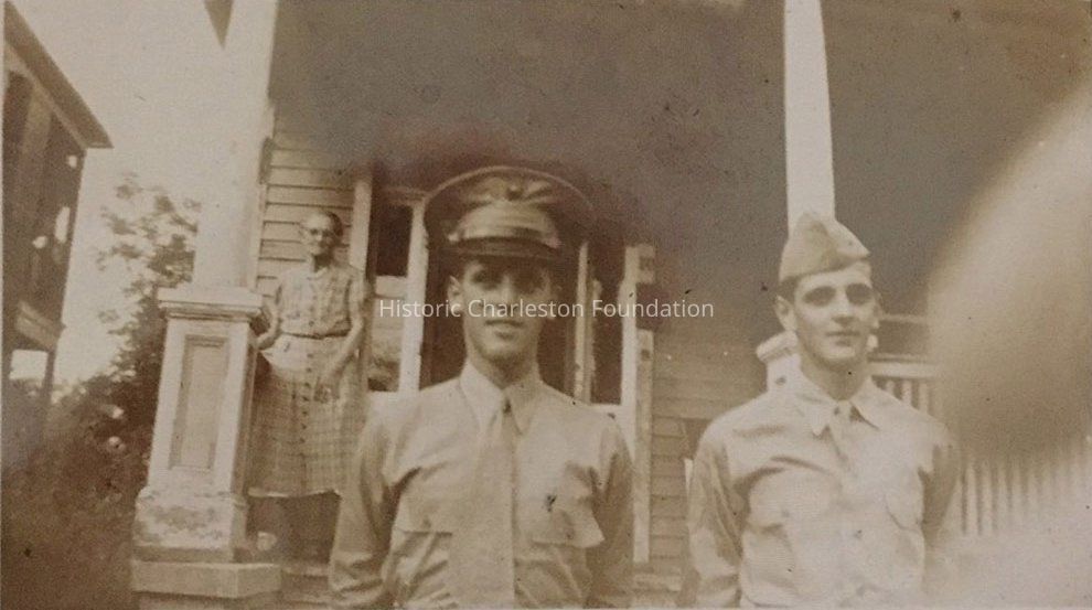 a: Two GIs stand in front of the house and an elderly woman stands on front porch. Building has the boxed column bases, which were later replaced by round columns.