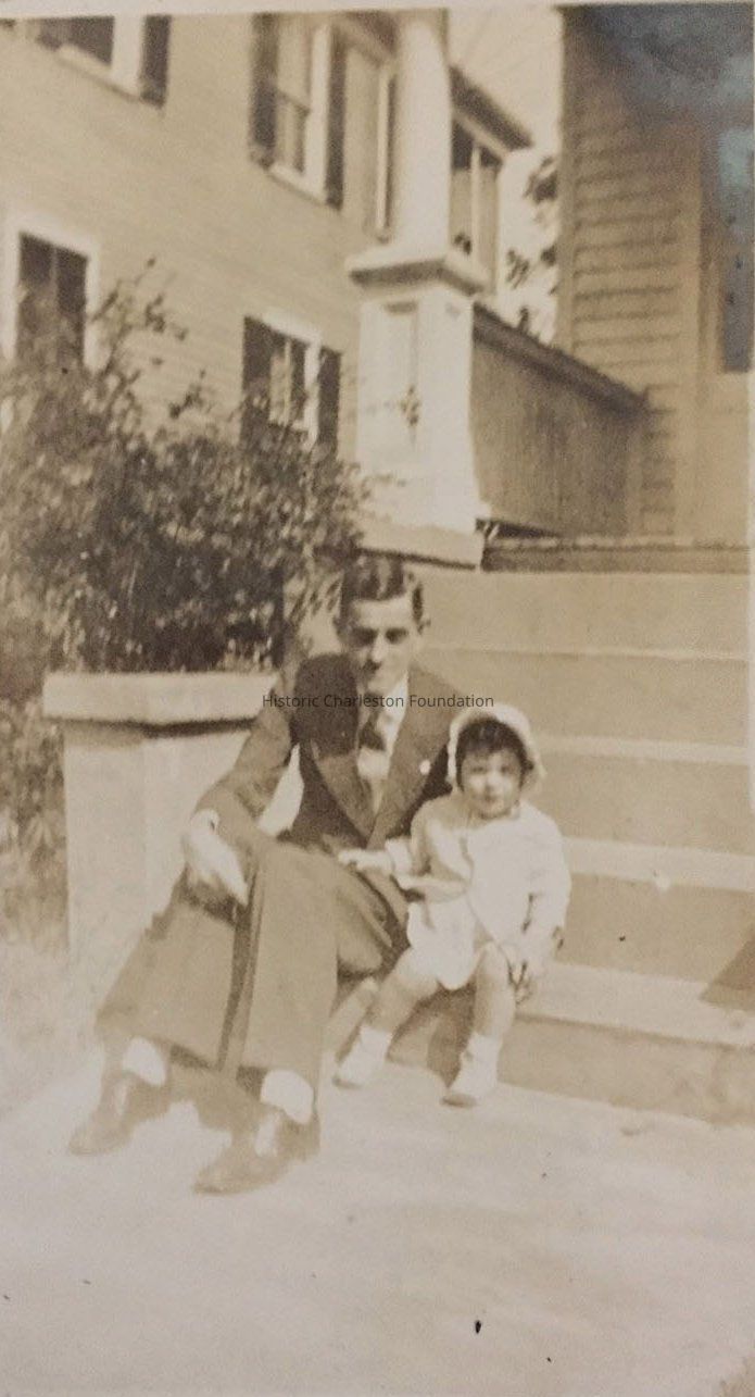 b: Man and a toddler seated on the bottom step to the entrance of 10 Sutherland Avenue.