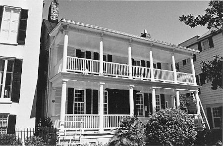 Constructed ca. 1800. The entrance into 10 Water Street was originally on the garden side of the house, opposite its current location, as the lot that the mariner Luke Swain acquired stretched to Stoll's Alley on the north and to Church Street on the west. The house faced the alley currently behind the house and had piazzas overlooking Vanderhorst Creek, which soon thereafter became Water Street. Swain lived on the alley and sold the property, with or without a dwelling, to another mariner, George Hussey, in 1800. By the time of an 1826 plat, the building had assumed its present form including its front piazza, hipped roof, and other features. Of particular note, two doors with twin Neoclassical architraves provide separate entries to the front rooms, a characteristic of some Cooper River Plantation houses but unknown in the city. (Poston, Buildings of Charleston.)