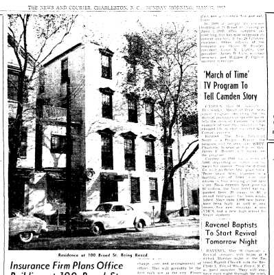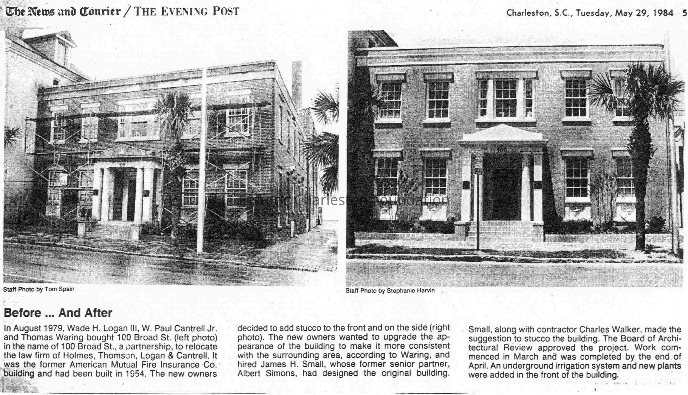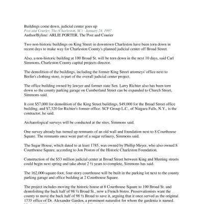 The original lot at this site was large and later divided into two lots now known as 98 and 100 Broad Street. It was owned by Dr. Alexander Garden, the prominent naturalist for whom the gardenia was named. Garden was a Tory and was forced to abandon the property when the British were ousted in 1782. The four-story brick residence was possibly constructed by Dr. Samuel Wilson who bought the property in 1822. In 1953, American Mutual Fire Insurance Co. bought the building, which was demolished for the construction of a two-story office building designed by Albert Simons. The American Mutual building was demolished ca. 1997 for the construction of the Judicial Center that stands on the site today; it references the early 19th c. building through architectural details such as the semicircular window in the gable.