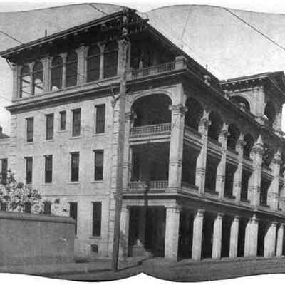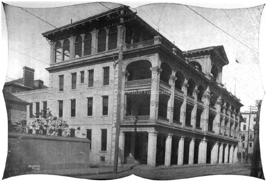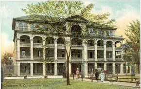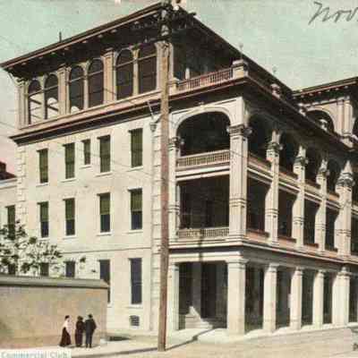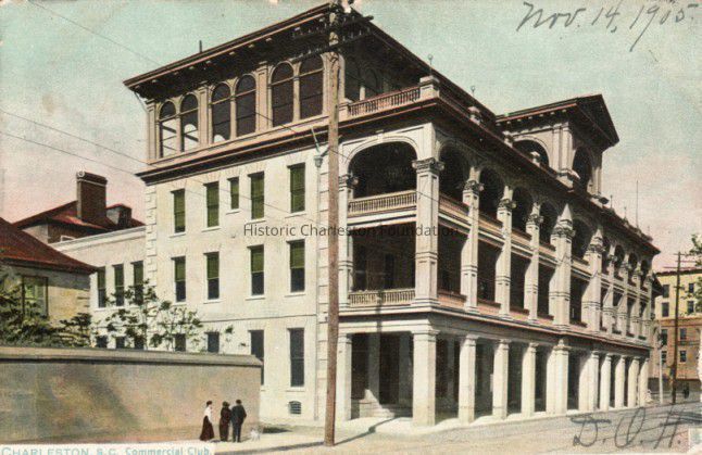 The Commercial Club stood on Meeting Street between the Charleston County Courthouse and Hibernian Hall. The building was a late-19th century row of four attached tenements, remodeled as a residential/businessmen’s clubhouse ca. 1904. In 1918 the clubhouse was converted into the Timrod Inn (later known as Hotel Timrod). The porches were added some time before 1940. The hotel closed at the end of 1955, and in 1964 it was demolished to clear a site for the Charleston County Office Building. (Source: Preservation Society, Halsey Map Project)