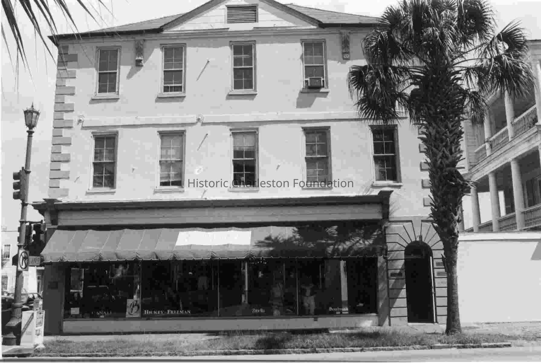 B&W photograph of 104 Broad Street (Ann Bocquet House), south (front) elevation. Also knwon as the Broad Street elevation of the clothing store Berlin's (114 King Street).Collection