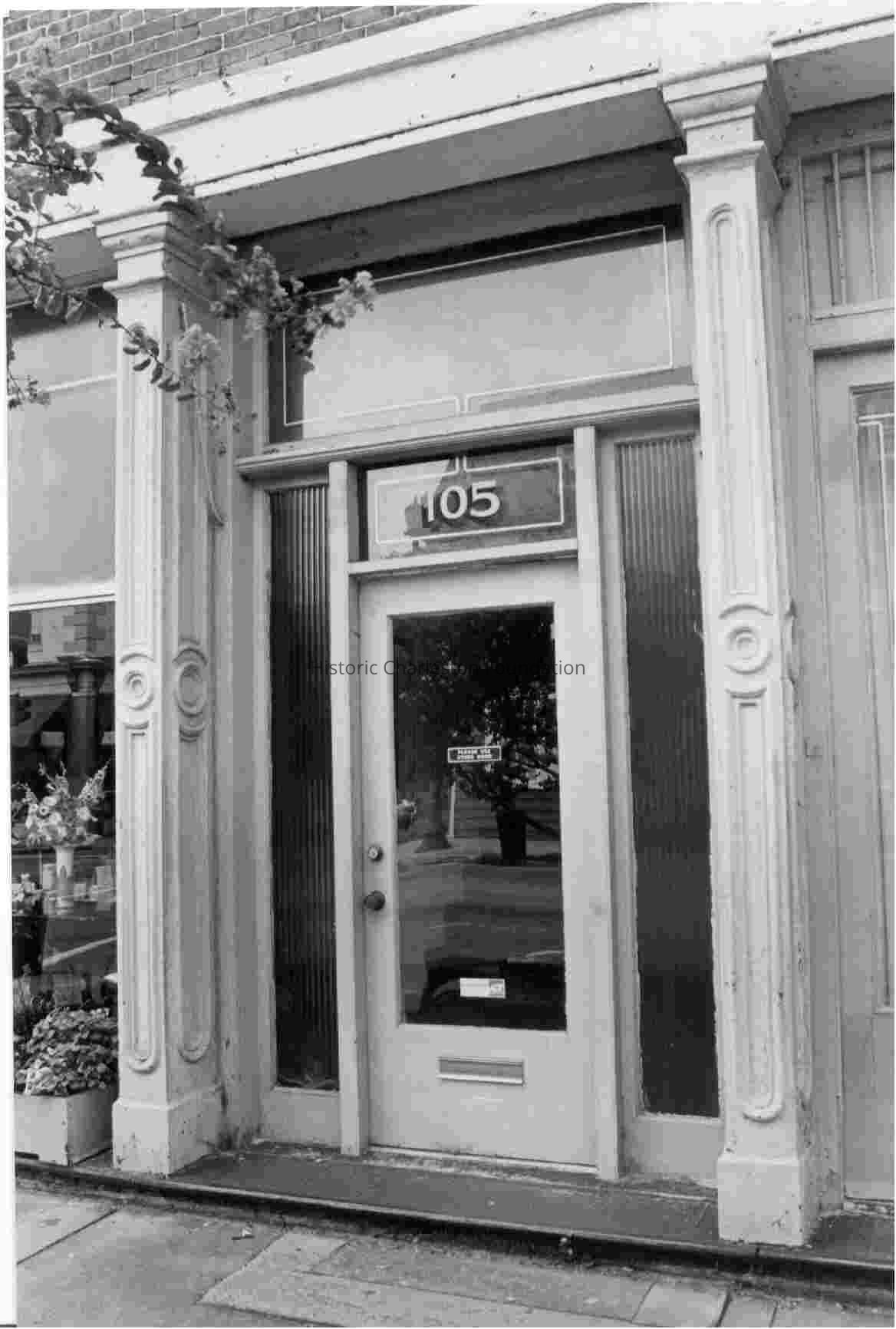 B&W photograph of the entrance to 105 Broad Street (William L. Bredenburg Store and Residence), once the location of Historic Charleston Foundation's Reproductions Shop. Two copies of photo in sleeve.Collection