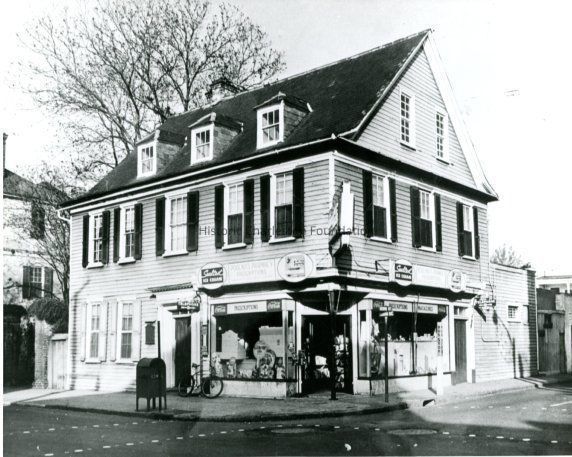 B&W photograph of Poulnot's Drug Store at 106 Broad Street [John Lining House], southeast elevation, showing the storefronts on both sides of the building and the corner of King and Broad Streets. Two copies of photo in sleeve; negative in sleeve.Collection