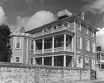 Constructed ca. 1767-72; wing and piazzas added before 1850; restored with additions 1934. A rare example of a side-passage plan from the Colonial period, this lavishly fitted house was built by John Stuart, a Scotsman who became superintendent of Indian affairs for the southern colonies and thereby held seats on the governors' councils of Virginia, North Carolina, South Carolina, and Georgia. Stuart acquired the large lots at the southernmost end of the Orange Garden tract by mortgage to the owner Alexander Petrie. He fled the house in 1775, and it was sold in 1782 as confiscated property to the merchant Alexander Gillon. The exterior of the building has flush weatherboarding, pedimented window surrounds, and one of Charleston's most elaborately carved wooden door surrounds: a pediment with engaged, fluted Corinthian columns, possibly derived from a plate in Edward Oakley's Magazine of Architecture, Perspective, and Sculpture (1730). The first floor of the side wing and the piazzas were added in the 19th century. In the 1920s the woodwork from the first-floor sitting room and the large drawing room on the second floor was sold to the Minneapolis Institute of Arts for display in a period room. In 1934 the architectural historian John Mead Howells of New York and Portsmouth, New Hampshire, bought the property as a winter home and reproduced the original woodwork in these rooms. He added a second floor to the polygonal wing and developed a formal French garden west of the house. Howells became a pivotal figure in the Charleston preservation movement in the 1930s and 1940s. (Poston, Buildings of Charleston.)
