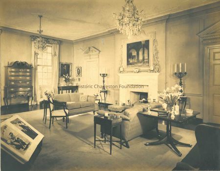 B&W photograph of an interior room of 106 Tradd Street (Col. John Stuart House), with doorways, fireplace and mantel, chandeliers, and furnishings.Collection