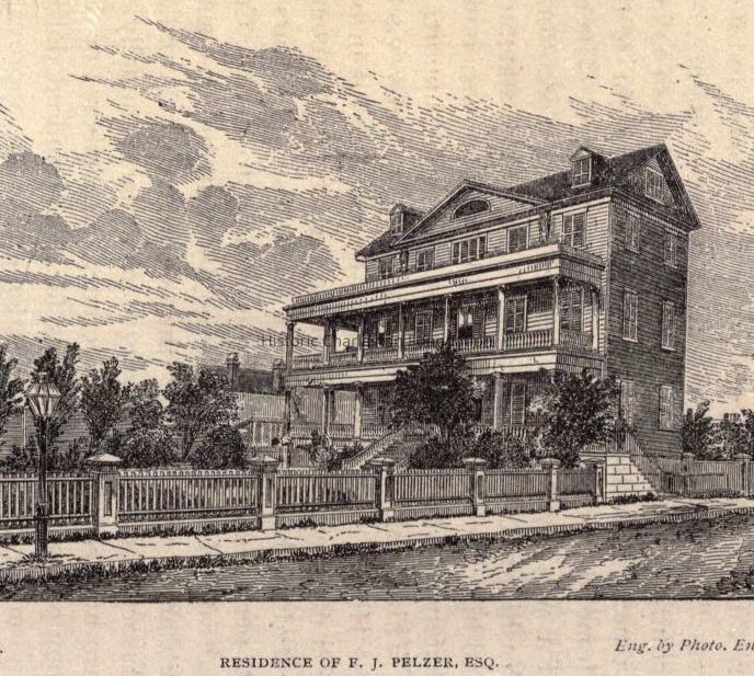 Up until about 1916, the garden extended from the main house to Bull Street. The buildings to the north were servants' quarters and stable buildings. Francis J. Pelzer was one of its prominent occupants; his initials are etched in the glass of the front door and the house has become known as the "Francis J. Pelzer House." The story is that the staircase was omitted from the original house plan, leading to the unusual outside stairway arrangement--one with a landing that leads to the street, one which leads down from the piazza to the yard, and now a third entrance to the spiral stairway which leads to apartments above. (Source: FOHG house history)