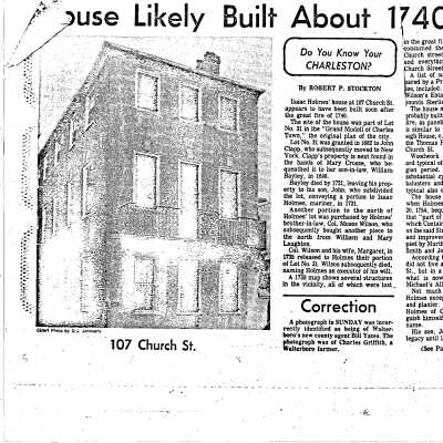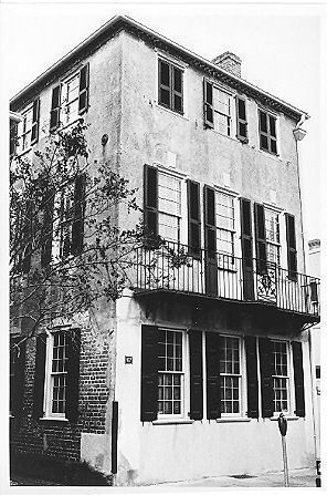 Constructed ca. 1740. The wealthy planter and mariner Isaac Holmes, who lived a few doors to the south, built this 3-story stuccoed dwelling to replace a structure burned in the fire of 1740. The house, which retains its important early woodwork, was altered in the late-18th century with the addition of a wrought-iron balcony on the 2nd floor. It was probably after the subdivision of the property in the 1780s that John and Elizabeth Geyer built the small stucco house at 105 Church Street. Holmes also built another tenement at 2 St. Michael's Alley, a 2-story stucco dwelling with a Greek Revival piazza that was partially enclosed in the 1980s.