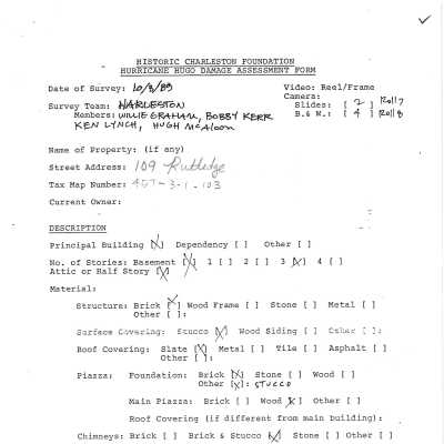 Three files contain documentation of the easement on the property including related correspondence and Confirmation of Understanding; Part I certification (National Register); annual inspection reports; narrative history of the property (source of Part I certification application; historical research notes (HCF staff); plat (1979); Ward Book pages (1852-1881); photocopies of photos of carriage house and garage; Hurricane Hugo Damage Assessment.