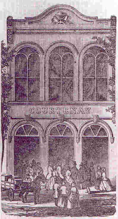 Photographic reprint of an engraving of 11 Broad Street (Courtenay Building). Illustrates advertisement for the book store. Reproduced from The Courier, 1856.
