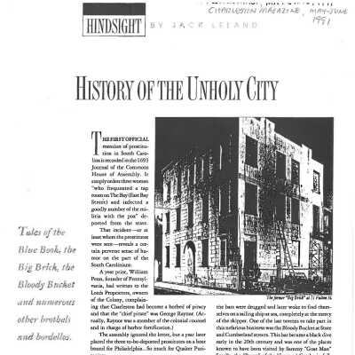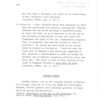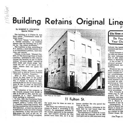 File contains building history from the Vernacular Architecture of Charleston & the Lowcountry; newspaper articles (including 1980, 1986 DYKYC); building history from Information for Guides of Historic Charleston; chain-of-title research notes; Charleston Magazine article "History of the Unholy City" about Charleston brothels, including 11 Fulton Street; photocopy of map (plat) of 11 and 13 Beresford Street (now Fulton Street), 1951; information about Grace Peixotto from This Happy Land.Collection